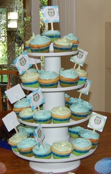 For the frosting, I just made some homemade cream cheese frosting (my favorite staple) and finally let me Kitchenaid run beyond speed two. This made a huge difference in how creamy the end product was, and I was very happy with it. Then some gel food dye and two different Wilton piping tips and you get a pretty decent beginner cupcake. Though I have to say, it's all in the presentation. The cupcakes wouldn't have looked half as nice if it wasn't for that amazing cupcake stand that a friend let me borrow. Note to self: purchase a cupcake stand.
